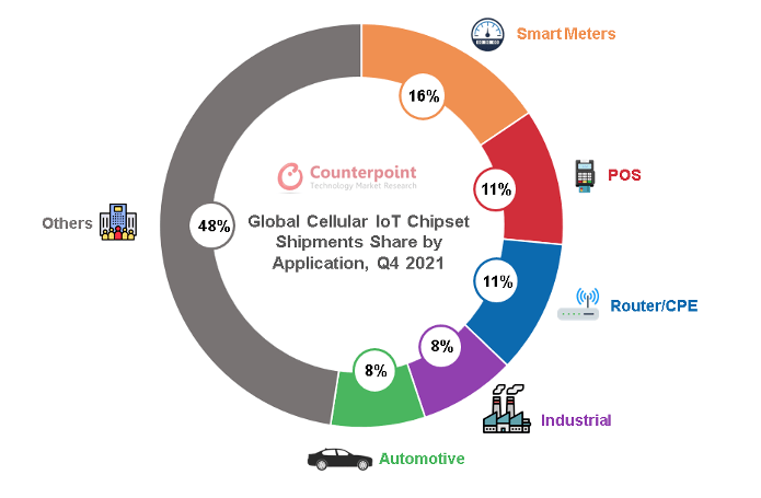 在蜂窩物聯(lián)網(wǎng)芯片中,當(dāng)前應(yīng)用規(guī)模最大的是低速率的NB-IoT芯片(占比60%),NB-IoT也是我國(guó)主推的物聯(lián)網(wǎng)連接方式,應(yīng)用在智能儀器表盤、資產(chǎn)追蹤等場(chǎng)景。其次是中速率的2G/3G(占比30%),用于移動(dòng)支付、智能穿戴和智能家居中。4G Cat.1和5G大約占比10%, 5G模組的成本過高,加上大部分物聯(lián)網(wǎng)終端對(duì)傳輸速率的需求性不高,5G在物聯(lián)網(wǎng)終端的應(yīng)用占比較低,主要是自動(dòng)駕駛和視頻監(jiān)控領(lǐng)域,但隨著2G/3G轉(zhuǎn)網(wǎng),Cat.1在智能支付、定位追蹤、車載終端、視頻監(jiān)控領(lǐng)域的高速增長(zhǎng),正逐漸打破蜂窩物聯(lián)網(wǎng)6:3:1的格局。從應(yīng)用場(chǎng)景來(lái)看,智能表計(jì)、POS支付、路由器/CPE、工業(yè)、汽車是蜂窩物聯(lián)網(wǎng)芯片應(yīng)用最廣泛的前五大場(chǎng)景。